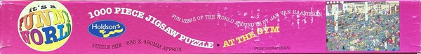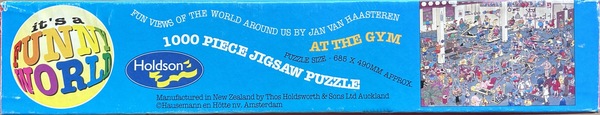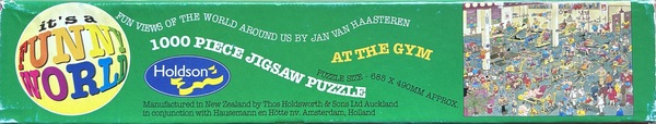 | Beschrijving | Deze puzzel is een onderdeel van een set van vier puzzels, uitgegeven door de Nieuw Zeelandse puzzelfabrikant Holdson Funny World (HFW). Deze puzzel heeft nummer 08472, evenals drie andere puzzels in deze set. Wil je meer weten over deze hele set lees dan de pagina 'Holdsons Funny World puzzels 08472'. Deze puzzel kom je zelden tegen, omdat al deze puzzels dus in Nieuw Zeeland zijn uitgegeven. Is ook meer een verzamelaars-item, omdat alle platen / tekeningen van deze puzzels ook wel in een Jumbo variant zijn uitgegeven in Nederland. Er is een set met oudere puzzels uitgegeven door Holdson Funny World - en deze dozen zien er allemaal anders uit dan de huidige herkenbare blauwe Jumbo puzzeldozen. Veel van deze dozen hebben meerdere vrolijke kleuren. In totaal zijn er 48 van deze oudere puzzels uitgegeven door Holdson Funny World (HFW) en dit zijn dan ook de zeldzamere. Ook op bijvoorbeeld marktplaats zie je deze puzzels vrijwel nooit voorbij komen. Je moet dan echt op tweedehands puzzel handelsplatformen gaan kijken in de buurt van Nieuw Zeeland en Australië. Nadeel - als je deze wilt kopen heb je veel invoerrechten om te betalen en vaak is de puzzel nog lang onderweg. Tot op heden worden er nog altijd puzzels van Jan van Haasteren uitgegeven in de door ons bekend blauwe puzzeldoos. Deze puzzels in de bekende blauwe dozen zijn NIET zeldzaam, want die kun je zo ergens in een webshop in Nieuw Zeeland bestellen. Deze puzzel 'At The Gym' met nummer 08472 is zeldzaam. Echter de tekening niet, want 'At The Gym' (In de Fitness) is ook uitgegeven in andere merken, bijvoorbeeld Jumbo. Juist de uitgave door HFW maakt hem dus zeldzaam en is dan vaak meteen een verzamelaars-item. Het is een prachtige kleurige doos met deze vier kleuren aan de vier zijkanten: blauw, groen, rood en roze. Op de achterkant van de doos kun je zien welke vier puzzels tot de 'set' met nummer 08472 behoren. |