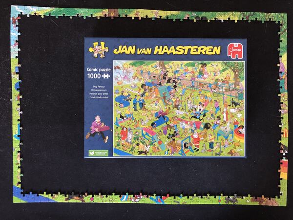 Ik heb de puzzel ‘Hondenparcours’ in alle rust gemaakt en heb er ook meerdere dagen over gedaan. Mooi op een puzzelmat gemaakt op de grond in de woonkamer. Ik neem wel de tijd op, maar ook weer niet heel precies, blijft toch een hobby dat puzzelen! Maar om een idee te geven hoe lang ik over deze JvH puzzel heb gedaan van 1000 stukjes:
