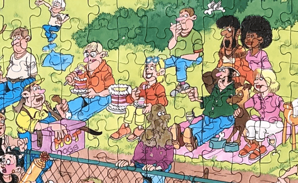Jan van Haasteren heeft nog een puzzel gemaakt die gaat over honden en dat was de puzzel ‘Hondenshow‘, dat is deze: