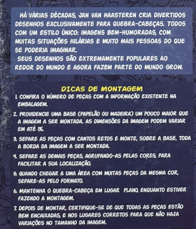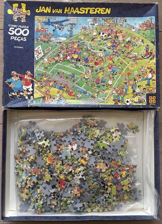 BeschrijvingEnorm zeldzame puzzel, sowieso zijn alle Jan van Haasteren puzzels uitgegeven door Grow heel zeldzaam. Je ziet ze vrijwel nooit ergens. De prijs voor deze puzzel is gebaseerd op een schatting van mij, omdat ik hem nog nooit op een marketplace voorbij heb zien komen. Grow is een Braziliaans puzzel- en speelgoedmerk dat in 1972 werd opgericht in São Paulo door vier ingenieurs. De naam is samengesteld uit de beginletters van hun voornamen. Het merk groeide snel uit tot een van de bekendste producenten van puzzels en spellen in Brazilië. Grow biedt een breed assortiment puzzels voor zowel kinderen als volwassenen, variërend van eenvoudige puzzels met 30 tot 100 stukjes tot uitdagende uitvoeringen met 5000 stukjes. De afbeeldingen lopen uiteen van dieren en landschappen tot wereldsteden en kunstwerken. Regelmatig werkt Grow samen met kunstenaars, waaronder de Braziliaanse pop-art kunstenaar Romero Britto, wat unieke en kleurrijke puzzels oplevert die ook geschikt zijn om in te lijsten. Naast puzzels produceert Grow bordspellen, kaartspellen en educatieve spellen, waardoor het merk een stevige positie in de Braziliaanse markt heeft opgebouwd en al tientallen jaren gezinnen en puzzelliefhebbers weet te vermaken. De puzzelstukjes wijken niet af van de vorm van de puzzelstukjes die wij gewend zijn. Soms is dat namelijk wel zo, zoals bij het merk Ceaco bijvoorbeeld.