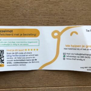 Dit is de andere kant van het harde kartonnen kaartje. Hierop staat een QR code, en als je die scant ga je naar bol.com en kun je daar een review invullen over The Friendly puzzelmat. Maak dan nog eens kans op een cadeaubon van 100 euro die Bol.co maandelijks verloot. Weet niet hoe groot je kans is om die cadeaubon te winnen, erg klein lijkt me. Mocht je nog vragen hebben, dan staat er op dit kaartje nog een e-mail adres (halle@thefriendly.nl), een whatsapp telefoonnummer (085-0470448) en een website die je kunt bezoeken: