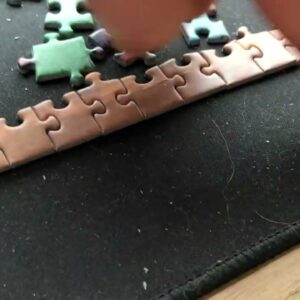 Deze puzzelmat heeft aan de onderkant rubber, en schuift dus geheel niet. Echt goed stroef. Aan de bovenkant zit er natuurlijk rubber, dat is het soort rubber waar duikerspakken van zijn gemaakt. En daar schuiven je puzzelstukjes wel goed op. Enige nadeel is dat er geen witte lijnen op staan, waar je je puzzel kunt gaan leggen (afhankelijk of je een puzzel van 500 of 1000 of 1500 stukjes hebt). Nu heb ik zelf een ‘ruimte’ moeten uitmeten op de puzzelmat. Ik vind dat zelf wel handig. Kleine min. Verder vind ik het erg belangrijk dat je makkelijk met puzzelstukjes kunt schuiven tijdens het puzzelen, en dat lukt zeker. Fijne ook van deze puzzelmat, hij is aan de zijkanten netjes afgewerkt met een iets hoger gestikt randje, wat voorkomt dat puzzelstukjes makkelijk van de puzzelmat afschuiven.