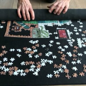 Zoals je ziet passen niet alle 1000 stukjes op deze puzzelmat. Ik vind dit zelf een nadeel, want als ik mijn puzzel ga opbergen in deze puzzelmat, dan moet ik een deel van de puzzelstukjes in de doos doen en als ik weer begin met puzzelen, moet ik de stukjes uit de doos weer allemaal goed gaan uitleggen. Lees over dit item eventueel meer op ‘welke puzzelmat moet ik kiezen‘.