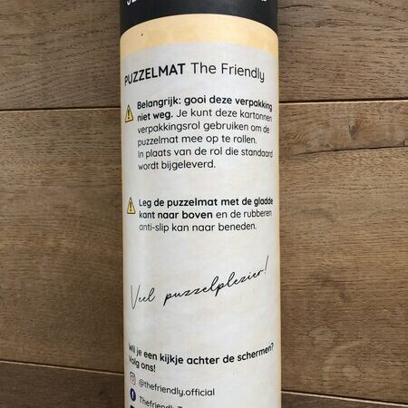 Er zit heel veel in de kartonnen buis van The Friendly. Dat is ook best nog een gewicht, The Friendly geeft zelf aan dat het 1,4 kilo weegt. Ter vergelijk: de Jumbo puzzelmat voor 3000 stukjes weegt 1,1 kilo. Wat zit er in totaal in de verpakking: