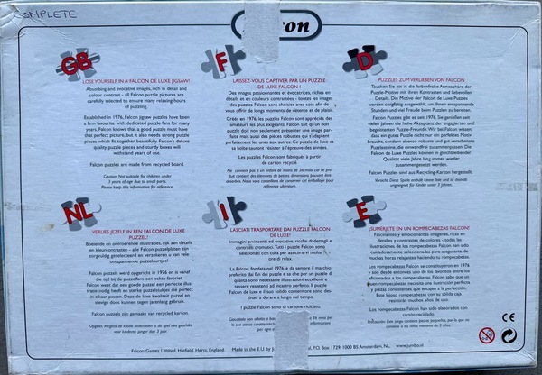 Jumbo en Falcon zijn dus hetzelfde bedrijf - Falcon is de Britse tak, speciaal gericht op de Engelstalige markt. Falcon de luxe is eigendom van het Nederlandse puzzelbedrijf Jumbo en is gespecialiseerd in nostalgische en sfeervolle afbeeldingen met een typisch Brits tintje. Op de doos staat dan ook altijd Falcon - maar achter de schermen is het gewoon Jumbo-kwaliteit.
