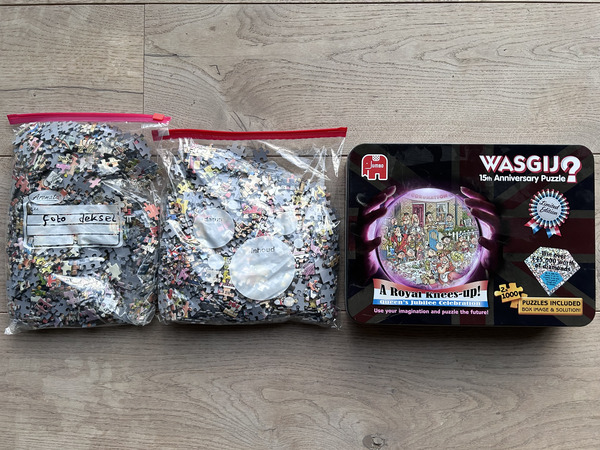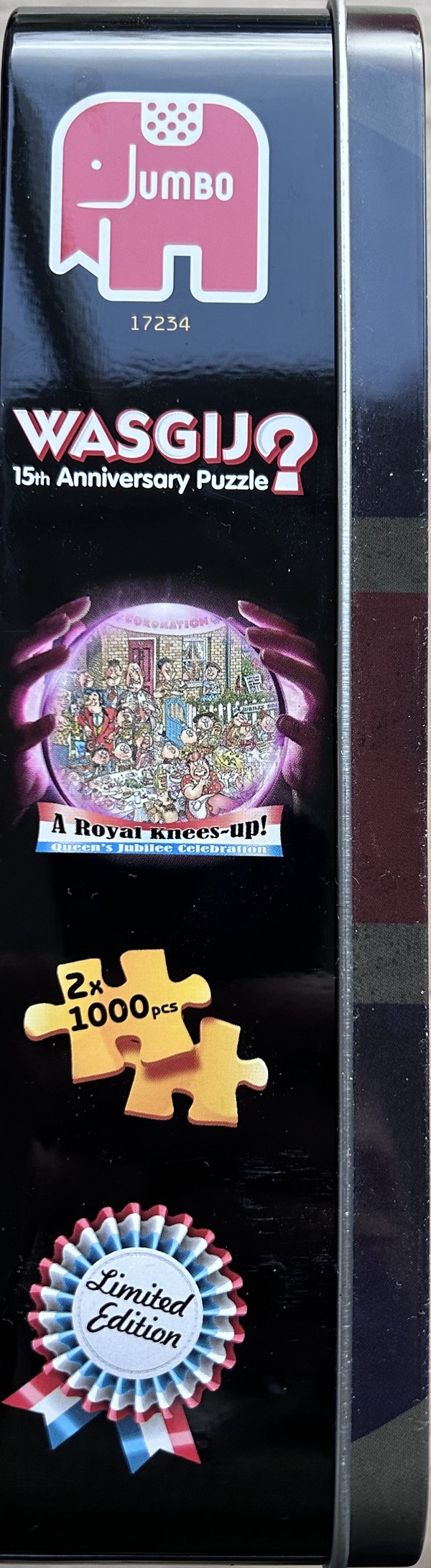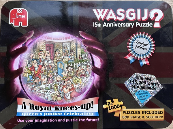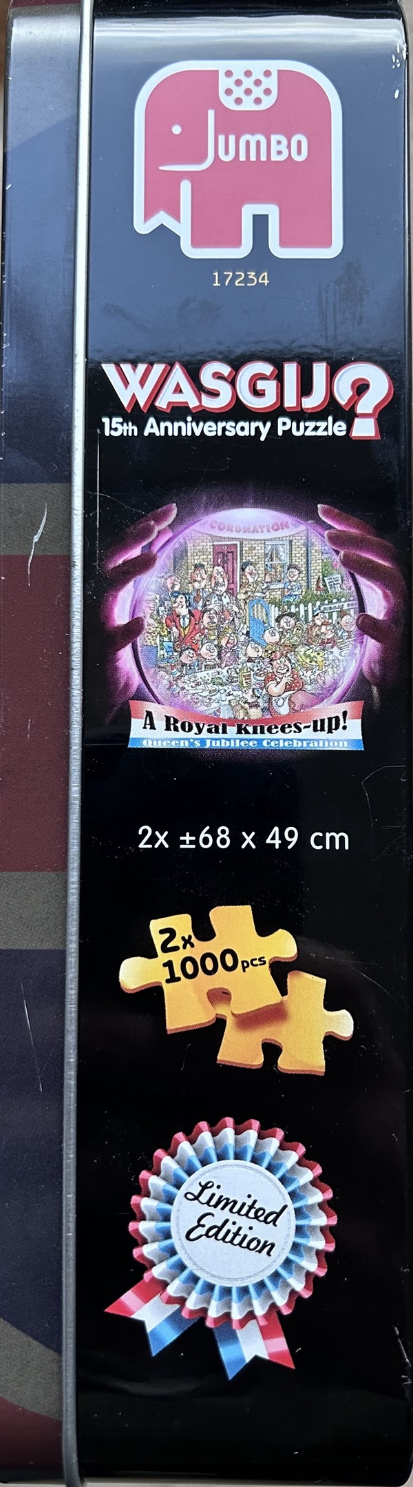 Welkom bij een nieuwe video. In deze video laat ik een hele speciale en zeldzame puzzel van Wasgij zien. Dit is de puzzel Royal Knees Up – Queen’s Jubilee Celebration. Het gaat om een set met twee puzzels van elk 1000 stukjes. Op de verpakking staat ook duidelijk dat het een Limited Edition is. In deze video vertel ik meer over deze puzzel, die is uitgegeven in 2012. Het bijzondere is dus dat het een set is met twee puzzels van 1000 stukjes. Hier zie je de afbeelding van het deksel van de puzzel. Dat is de eerste afbeelding. De andere puzzel laat de situatie zien zoals die later zal zijn. Daardoor is dit een puzzel uit de Wasgij Destiny-serie. Deze uitgave staat ook in het teken van het 15-jarig jubileum van Wasgij. De Wasgij-puzzels zijn namelijk begonnen in 1997. Toen deze puzzel werd uitgebracht in 2012, bestonden de Wasgij-puzzels dus precies 15 jaar. Maar er is nog meer te vertellen over deze puzzel. De titel Royal Knees Up hangt namelijk ook samen met het feit dat Queen Elizabeth II zestig jaar op de troon zat in Engeland. In Engeland betekent een “Royal Knees Up” eigenlijk een uitbundig feest, een groot koninklijk feest. Dat maakt deze puzzel dus extra bijzonder.