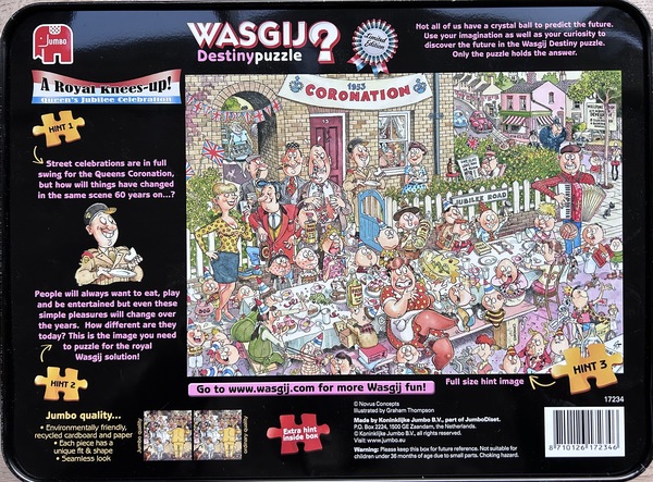 We zien hier nog iets opvallends op de verpakking. Er staat namelijk een actie op: je kon voor meer dan £45.000 aan diamanten winnen. Op de sticker staat dat je in de verpakking moest kijken voor meer informatie. En het is geen gewone doos, maar een blik. Je hoort ook meteen dat het een ander materiaal is. In het blik zat destijds een formulier met een prijsvraag. De eerste prijs was een grote diamant. Daarnaast waren er vijf tweede prijzen, waarbij de winnaars een kleinere diamant kregen. In totaal waren er dus zes winnaars, met een gezamenlijke waarde van £45.000. De actie liep tot en met 31 januari 2013. Dat betekent dat de actieperiode liep in 2012 en 2013. Niet op elk blik van deze puzzel zit deze sticker. Daarom is deze uitvoering met de sticker één van de eerdere uitgaven uit die actieperiode. En daardoor is deze versie ook zeldzamer. Er bestaan namelijk ook blikken van deze puzzel zonder de actie-sticker. Dat maakt deze dus een van de eerste exemplaren die tijdens die actieperiode zijn uitgebracht. Als we nog even naar de zijkanten kijken, zien we onder andere de afmetingen van de puzzel: 68 bij 49 centimeter. Aan de achterkant van het blik zie je ook nog wat extra informatie. Daar staat bijvoorbeeld een hint over hoe de situatie later zal zijn, wat typisch is voor een Wasgij Destiny-puzzel. Je krijgt dus aanwijzingen, maar uiteindelijk moet je natuurlijk zelf gaan puzzelen om te ontdekken wat er gebeurt. Het blijft natuurlijk extra leuk dat deze puzzel in een blik zit. Daardoor is het echt een bijzondere en zeldzame Wasgij-puzzel, en daarom ook echt een verzamelobject voor puzzelliefhebbers.