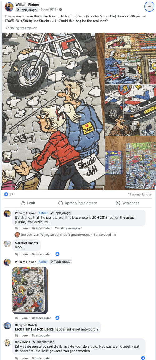 Dit is zeker een hele zeldzame Jan van Haasteren puzzel. Ik heb hem via Marktplaats kunnen kopen in September 2023. Ik heb hem gekocht voor € 47 euro. De één na hoogste bieder van 42 euro. In principe reken je voor een tweedehands puzzel € 0,01 per stukje. Een puzzeltje van 150 stukjes zou dan € 1,50 kosten en deze heb ik gekocht voor € 42! Ik heb nog gezocht achter het verhaal van deze puzzel. Er is nog zo'n ANWB puzzel, namelijk 'Kampeerplezier' met nummer 81456, beide zijn in 150 stukjes uitgegeven. Maar de puzzel 'Kampeerplezier' is net iets zeldzamer en dus duurder dan 'Verkeerspret'. Deze puzzel 'Verkeerspret' heeft als nummer 81457. Ik kon deze twee ook tegelijk kopen en wilde ze dus perse beide hebben. En gelukt! Maar deze puzzeltjes kon je in 2015 gewoon kopen in de ANWB winkels, echter wel in een beperkte oplage en ze zijn niet lang in de verkoop geweest, vandaar dat je ze bijna nooit tegenkomt. Verder niet heel veel bijzonders over te vermelden. Buiten dat deze puzzel 'Verkeerspret' ook nog is verschenen in de varianten: