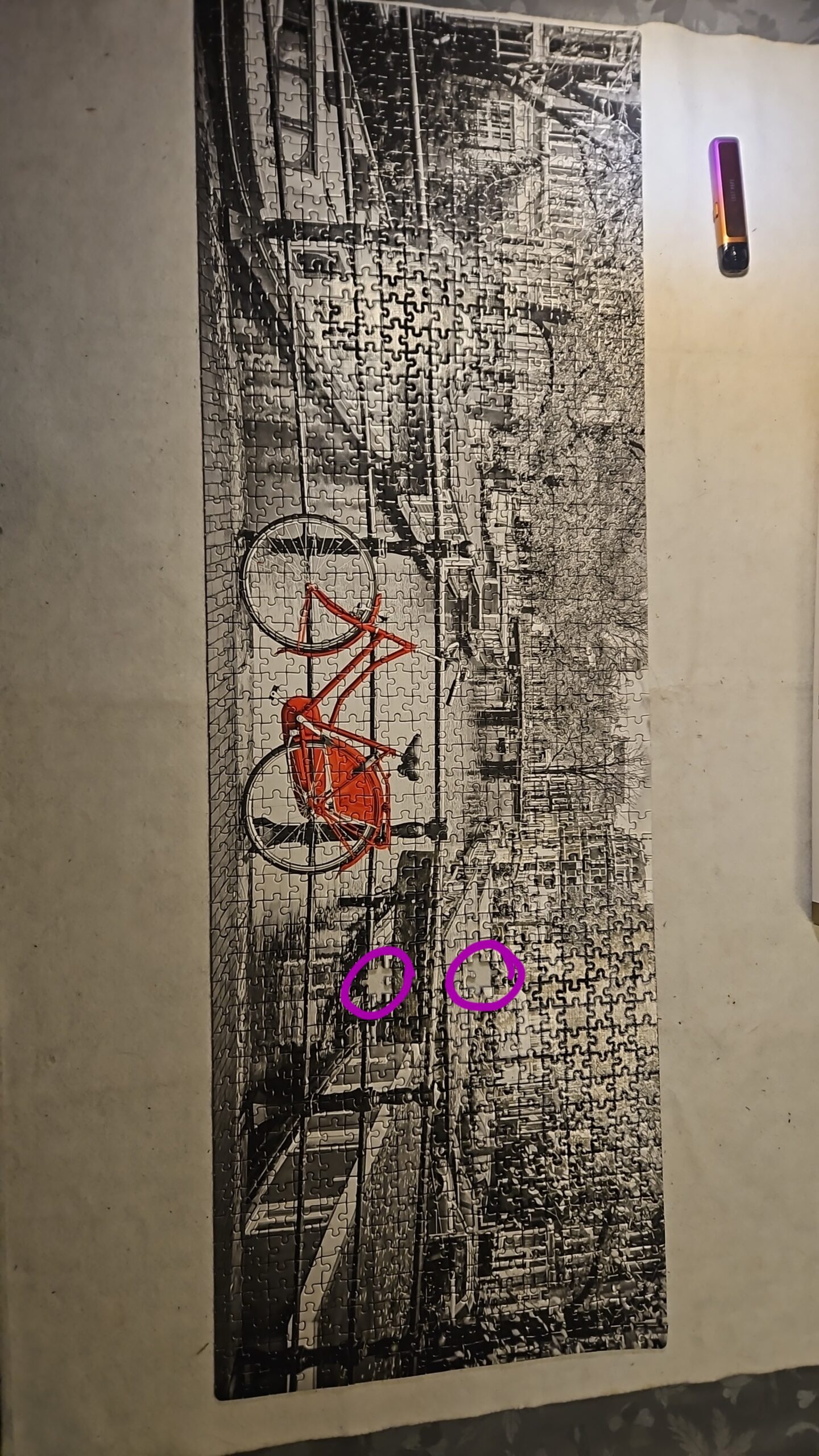 De puzzel is erg mooi geworden maar vreselijk moeilijk en deden er samen een aantal weken over. Door de grijstinten erg moeilijk. Op den duur maar stukje voor stukje gepast met 2 of 3 puntjes. Was niet te doen maar blij dat ie klaar is en is erg mooi is nu. HELAAS ontbreken er 2 stukjes😢