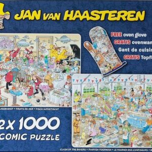 Het nummer 19003 van de Jan van Haasteren puzzel is een 2 in 1 puzzel. In deze doos zitten de puzzels: Zeebanket en Taarten Toernooi. Ook wel in het engels: ‘Seafood Supper’ en ‘Clash of The Bakers’.