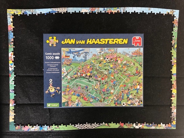 Ik heb de puzzel ‘Europa’s Voetbalkampioenen’ in alle rust gemaakt en heb er ook meerdere dagen over gedaan. Mooi op een puzzelmat gemaakt op de grond in de woonkamer. Ik neem wel de tijd op, maar ook weer niet heel precies, blijft toch een hobby dat puzzelen! Maar om een idee te geven hoe lang ik over deze JvH puzzel heb gedaan van 1000 stukjes: