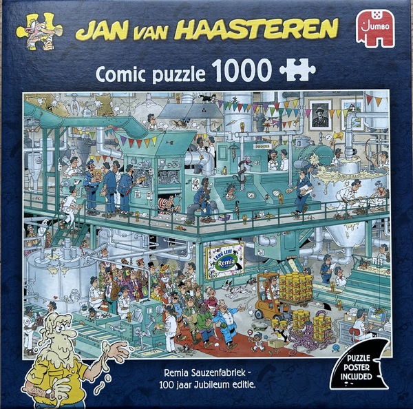 Ter ere van het 100-jarig bestaan van Remia verscheen in 2025 een bijzondere jubileumpuzzel: Remia Sauzenfabriek – 100 jaar. Deze uitgave is gebaseerd op de puzzel De Chocoladefabriek en werd speciaal aangepast in de stijl van de iconische sausfabriek in Den Dolder, waar Remia al decennialang gevestigd is. De puzzel werd exclusief uitgedeeld tijdens het grote jubileumfeest op 25 oktober 2025, waar artiesten als Gerard Joling, Donnie en Davina Michelle optraden. Medewerkers kregen naast een jubileumboek ook deze unieke Jan van Haasteren 1000 stukjespuzzel cadeau. Een vrolijke, chaotische fabriek vol fritessaus, humor en herkenbare Jan van Haasteren-figuren – een echte hommage aan 100 jaar Remia, het merk dat al sinds 19 oktober 1925 smaak op tafel brengt.